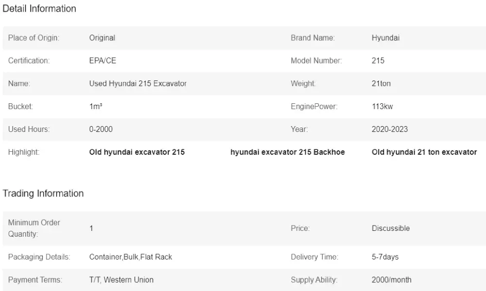 Machine in good condition, 95%new.Hyundai 215 is 21ton,power is 113kw with 800hours rotation was done. Available for testing.Machines can be used in mining and engineering construction.You can entrust third party individuals or organizations to inspect our products before delivery. It is in stock and can be shipped at any time